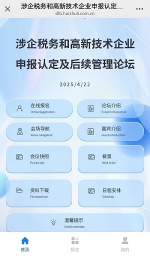 會議首頁定制內容包括在線報名,論壇介紹,會議導航,餐票,資料下載,日程安排等內容板塊。