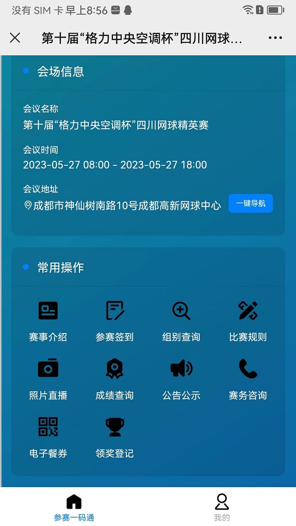 常規(guī)操作包括賽事介紹,參賽簽到,組別查詢,比賽規(guī)則,照片直播,成績查詢,公告公示,賽務(wù)資訊,電子餐券,領(lǐng)獎登記等信息。