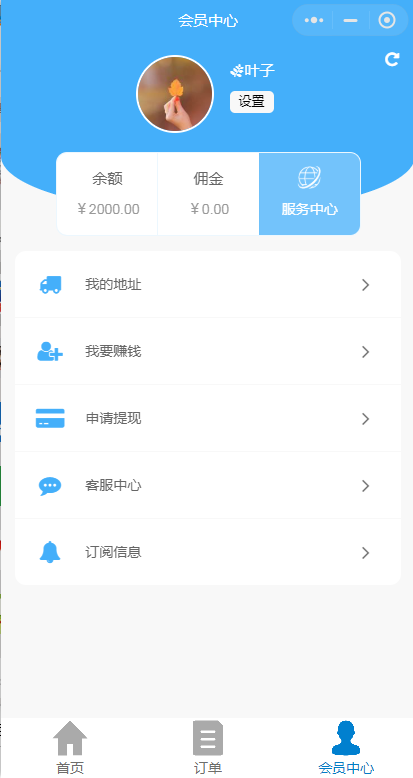 我的,會員中心可以查看我的地址,我要賺錢,申請提現,客服中心,訂閱消息。